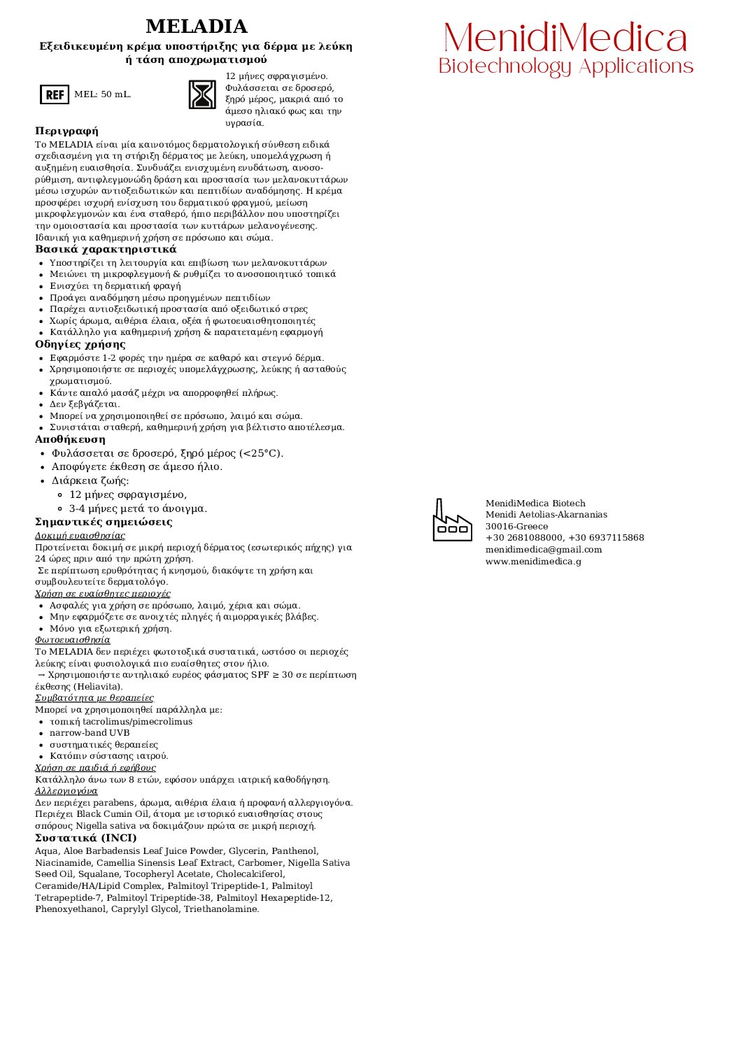 Η Meladia είναι μια προηγμένη δερματολογική φόρμουλα, ειδικά σχεδιασμένη για τις ιδιαίτερες ανάγκες της επιδερμίδας με λεύκη. Με μοναδική σύνθεση που συνδυάζει τεχνολογία πεπτιδίων, βιταμίνη D3, αντιοξειδωτικά φυτικά εκχυλίσματα και ενυδατικούς παράγοντες, προσφέρει ολιστική φροντίδα, προστατεύοντας, ενδυναμώνοντας και αναδομώντας το δέρμα.